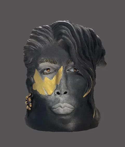 Black Glaze/Gold Leaf Scar, rhinestone Earring and Eyes.